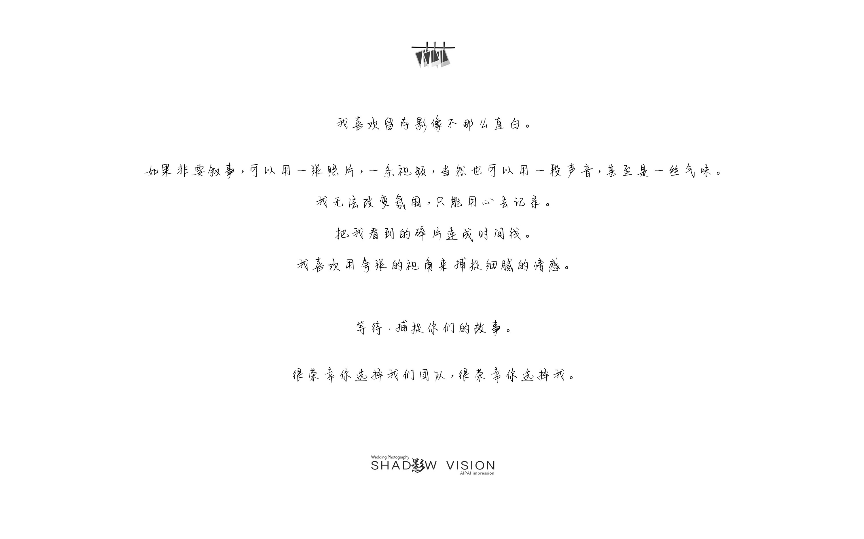 我们从2018年成为一家人,幸福地记录着关于幸福的一切。星辰和大海,微笑与眼泪,光影作画,用爱见证。希望我们所服务的新人们,可以收获一份不一样的幸福。